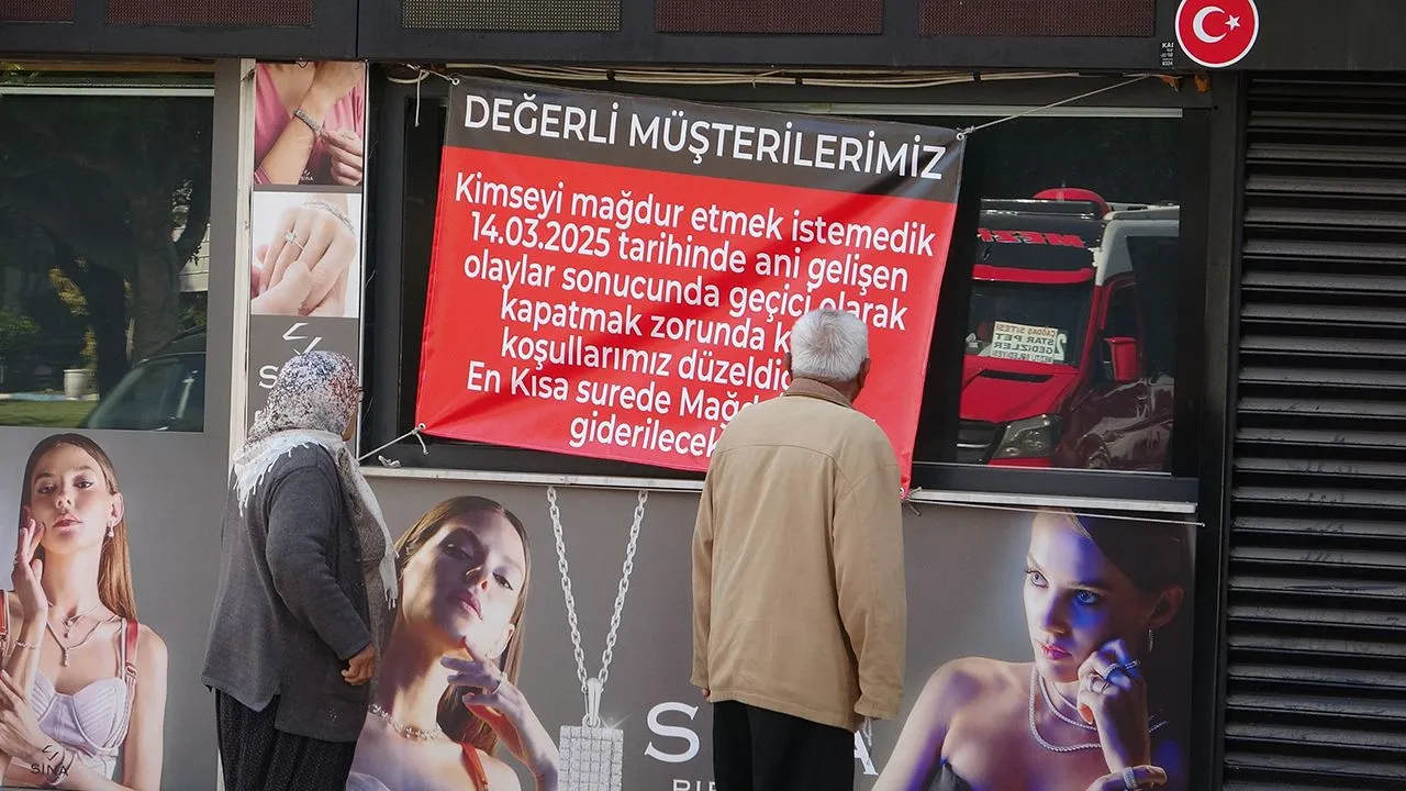 Mersin'de 116 müşterisinden yaklaşık 120 milyon lira vurgun yaptığı iddia edilen 2 müdürüyle birlikte tutuklanan kuyumcunun, "Kimseyi mağdur etmek istemedik, koşullarımız düzeldiği an en kısa sürede mağduriyetler giderilecektir" yazılı pankartla cevap vermesi dikkat çekti.