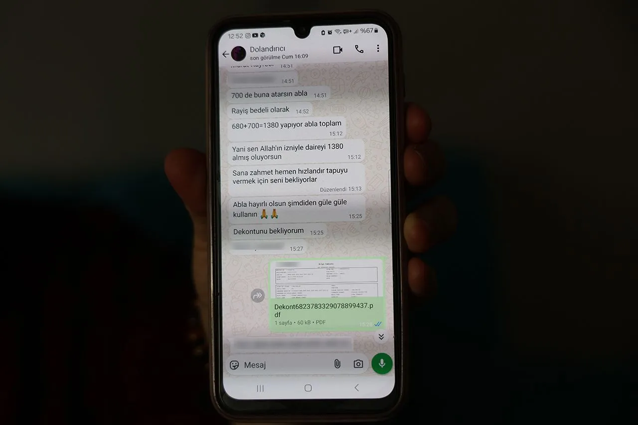 Aradan geçen 5 günün ardından tapu devri için kuruma giden Ş.G., hayatının şokunu yaşadı. İletişime geçtiği kişinin ev sahibinin vekâlet verdiği kişi olduğu yalanına inanarak 1 milyon 380 bin TL'sini dolandırıcıya kaptırdı. ‘Sazan Sarmalı' yöntemi ile dolandırılan Ş.G., yaklaşık 15 yıllık birikimini kaybetti. Olayla ilgili ifade veren 3 çocuk annesi Ş.G., dolandırıcının yakalanarak birikimine kavuşmayı bekliyor.