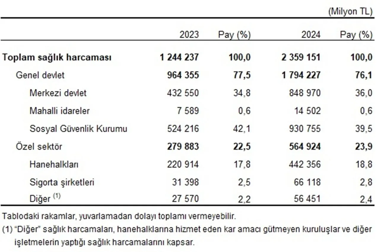 Genel devlet sağlık harcaması %86,1 artarak 1 trilyon 794 milyar 227 milyon TL'ye ulaştı. Özel sektör sağlık harcaması ise %101,8'lik bir artış oranı ile 564 milyar 924 milyon TL olarak tahmin edildi.