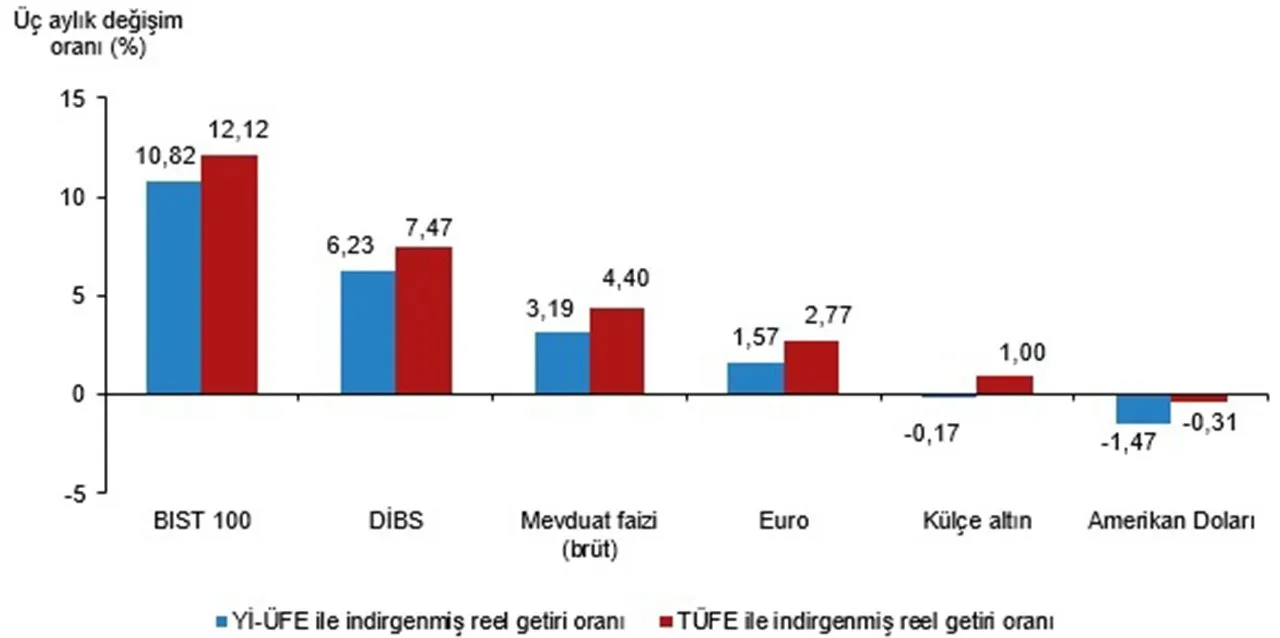 BIST 100 endeksi, üç aylık değerlendirmede; Yİ-ÜFE ile indirgendiğinde %10,82, TÜFE ile indirgendiğinde ise %12,12 oranlarında yatırımcısına en yüksek reel getiri sağlayan yatırım aracı oldu. Aynı dönemde Amerikan Doları; Yİ-ÜFE ile indirgendiğinde %1,47, TÜFE ile indirgendiğinde ise %0,31 oranlarında yatırımcısına en çok kaybettiren yatırım aracı oldu.