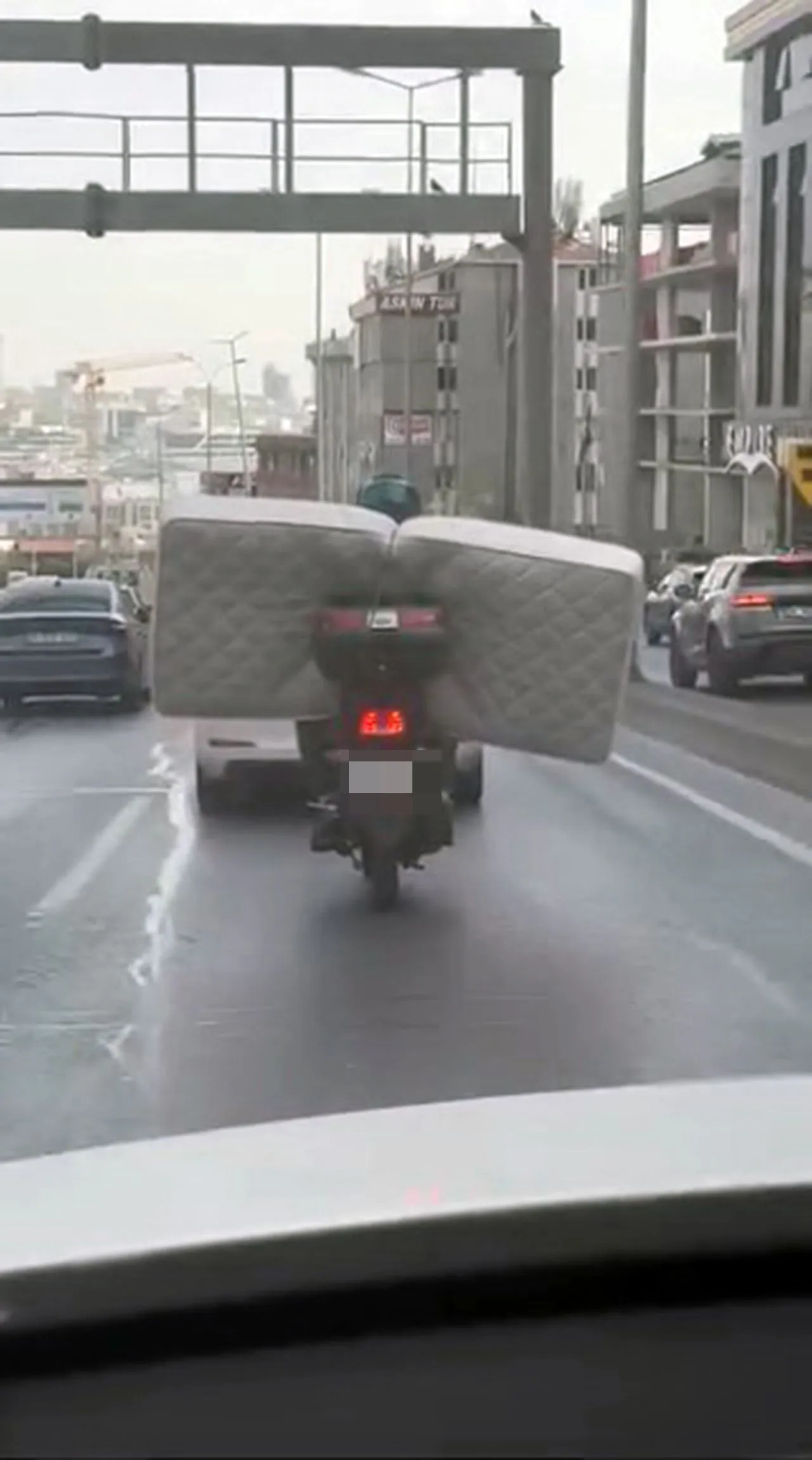 Karayoluna çıkan bir motosiklet sürücüsü, arkasına bağladığı yatakla ilerledi.