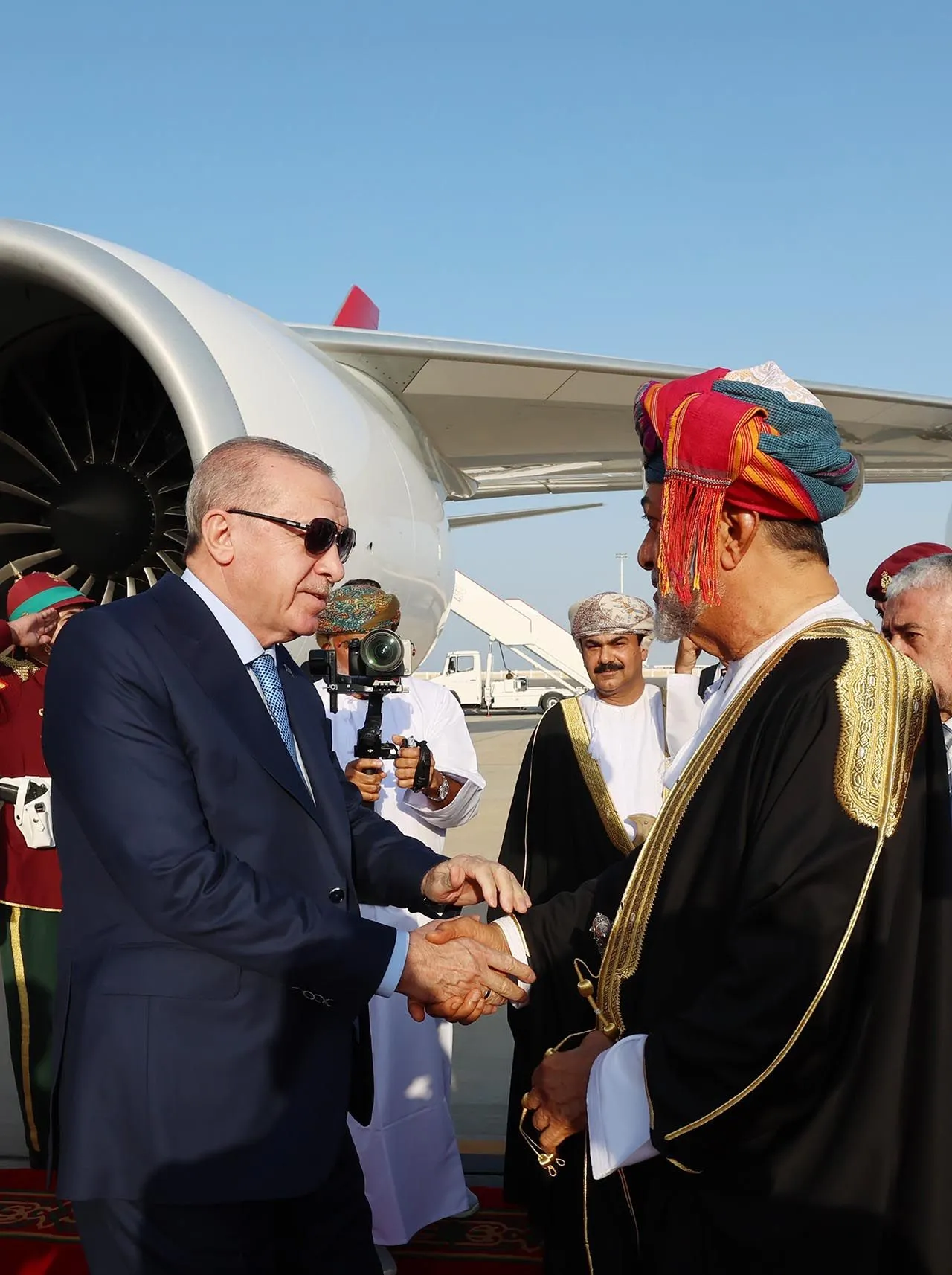 Cumhurbaşkanı Erdoğan, Katar'ın ardından Umman'a geçerken Maskat Havaalanına inişinde F-16 savaş uçakları eşlik etti. Erdoğan, Umman Sultanı Heysem bin Tarık bin Teymur El Said’e Togg hediye etti.