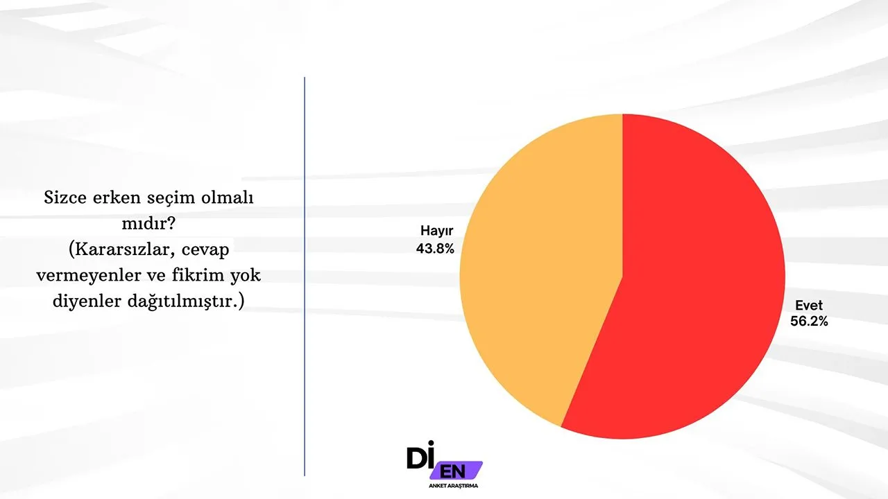 Ankette bir diğer soru ise “Sizce erken seçim olmalı mıdır?” şeklinde oldu. Erken seçim isteyenler yüzde 56.2 çıkarken erken seçim istemeyenler ise yüzde 43.8 olarak yer aldı.