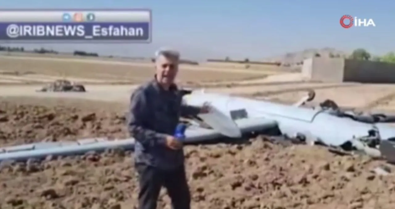 İran devlet televizyonu, düşürülen İsrail üretimi Hermes 900 tipi olduğunu açıklanan dronun görüntülerini yayınladı.