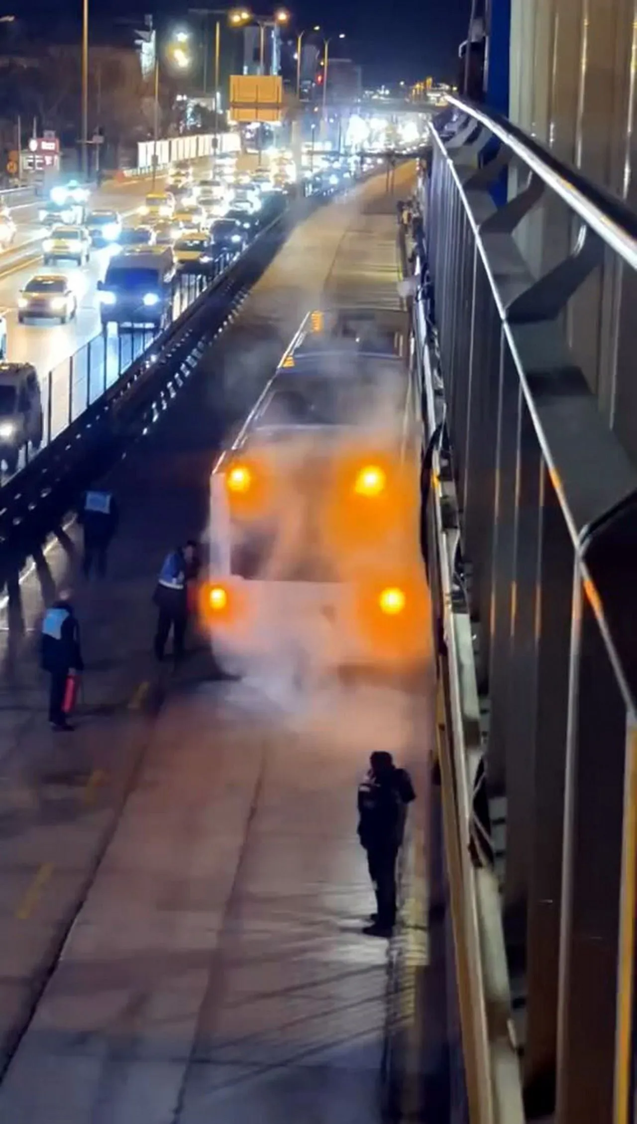 Metrobüsü durdurarak yolcuları indiren sürücü, yangın tüpü ile yangına müdahale etti. Duraktaki görevliler de yangın tüpleri ile motora müdahalede bulunarak yangını söndürdü. Metrobüsten indirilen yolcular, başka araçlara nakledildi" (DHA)