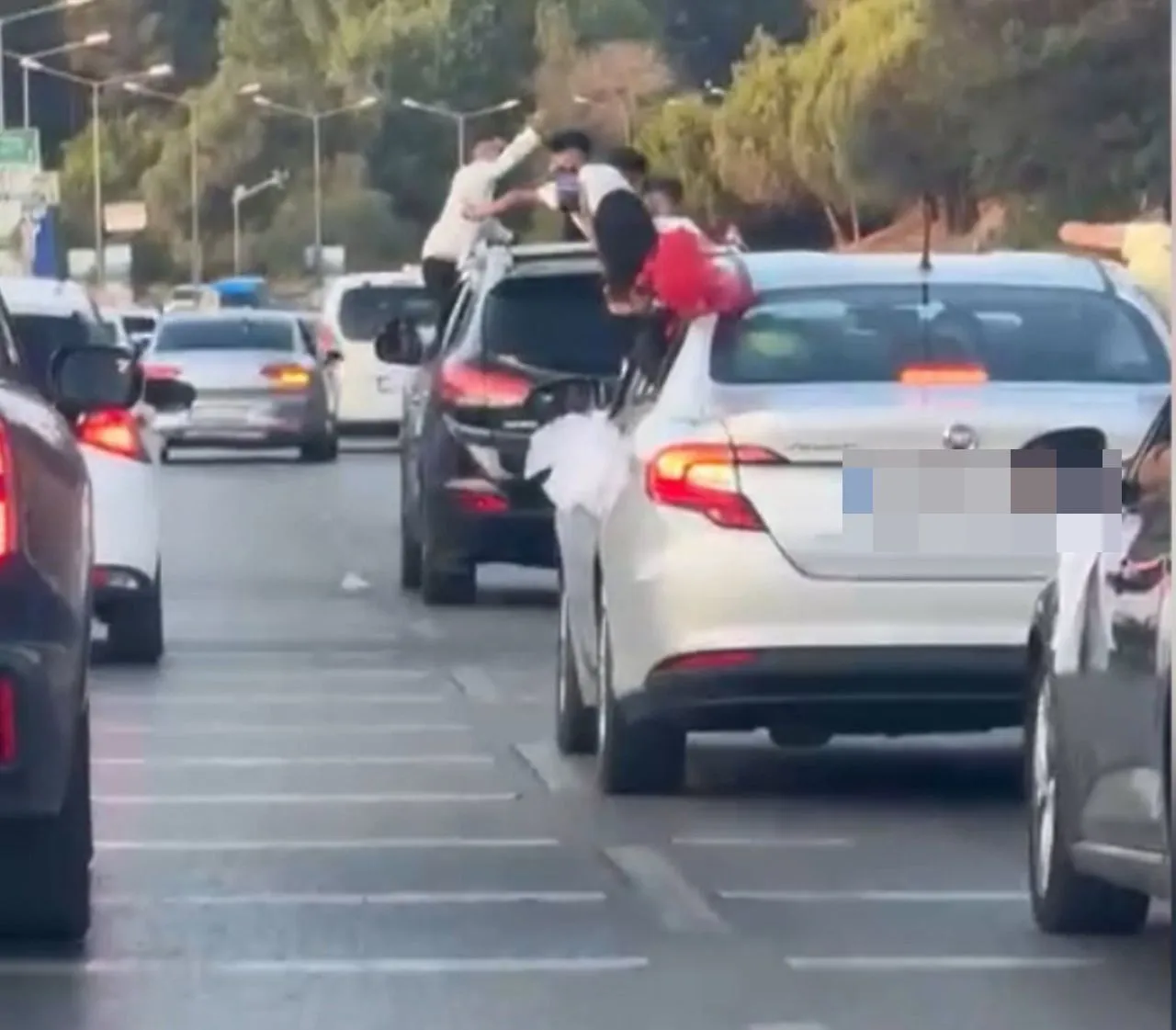 İstanbul'un Beyoğlu, Kağıthane, Sarıyer ve Ümraniye’de düğün kutlaması için araçlarla konvoy yapan sürücüler, slalom yaparak trafiği tehlikeye düşürdü. Yolda duraklama yaparak yoğunluk oluşmasına neden olan araçlar ve camlardan sarkanlar cep telefonu kamerasına yansıdı.