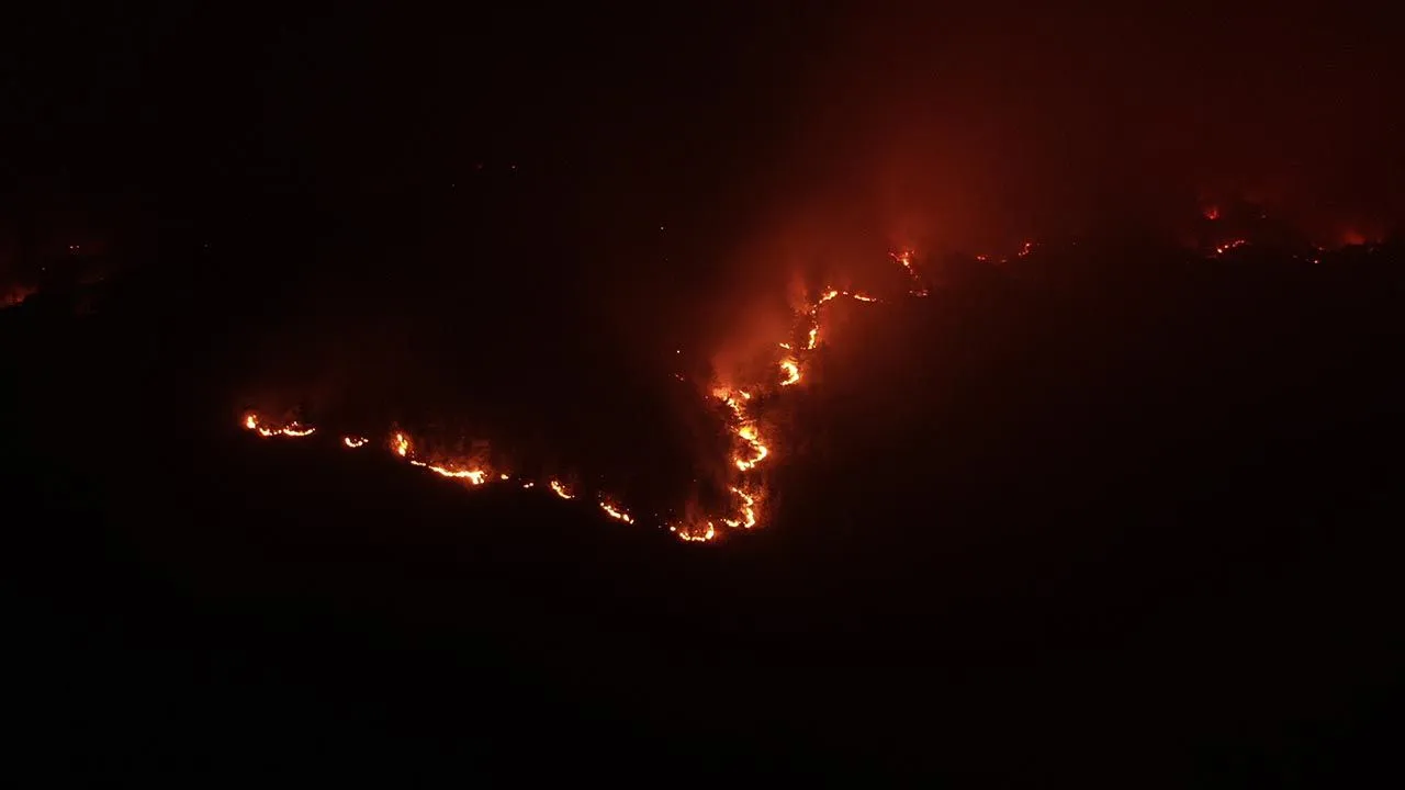 Ekipler, alevleri kontrol altına almak için yoğun çaba harcıyor. Yangın bölgesinde alevlerin etkilediği alanlar dronla havadan görüntülendi.