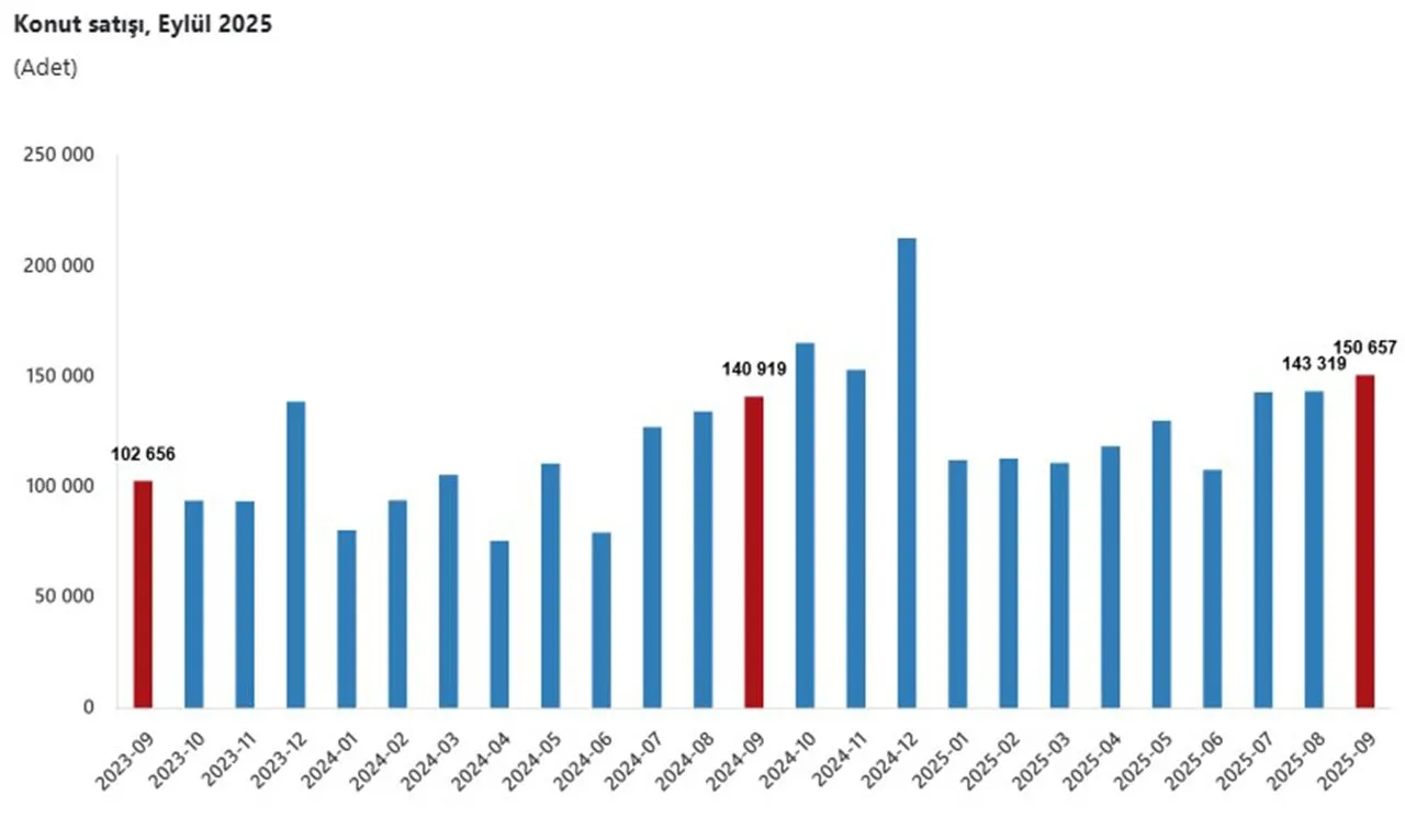 Türkiye genelinde konut satışları Eylül ayında bir önceki yılın aynı ayına göre %6,9 oranında artarak 150 bin 657 oldu. Konut satış sayısının en fazla olduğu iller sırasıyla 24 bin 119 ile İstanbul, 13 bin 417 ile Ankara ve 8 bin 544 ile İzmir olurken, en az olduğu iller sırasıyla 70 ile Ardahan, 117 ile Bayburt ve 142 ile Tunceli olarak gerçekleşti. Konut satışları Ocak-Eylül döneminde bir önceki yılın aynı dönemine göre %19,2 oranında artarak 1 milyon 128 bin 727 olarak gerçekleşti.