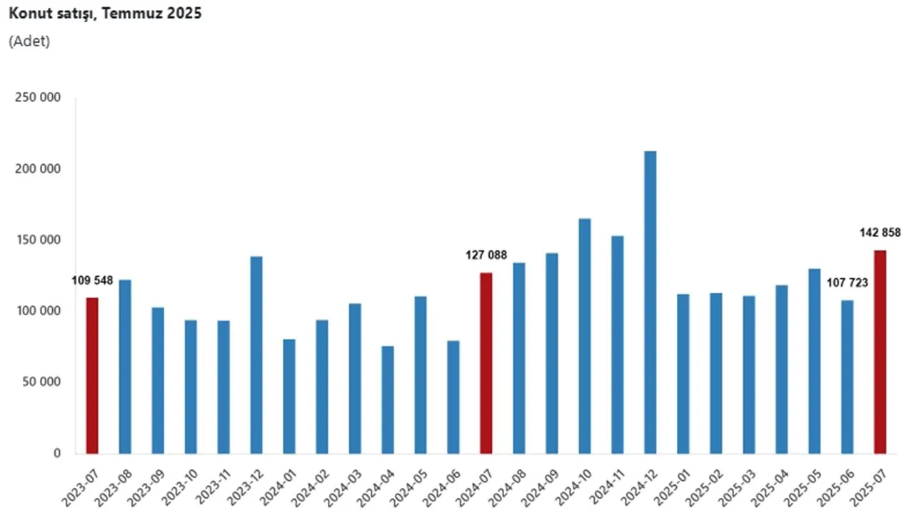 Konut satışları Ocak-Temmuz döneminde bir önceki yılın aynı dönemine göre %24,2 oranında artarak 834 bin 751 olarak gerçekleşti.