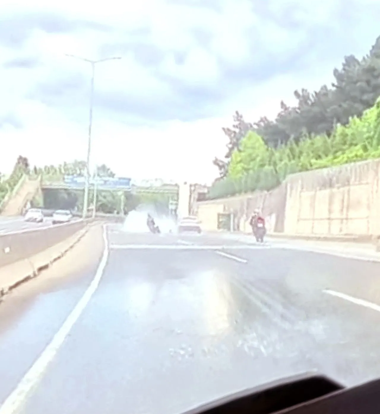 Kocaeli'de kanalizasyonun taşarak suların yola akması neticesi meydana gelen kazada 3 motosikletçi yaralanırken kaza anına dair görüntüler olası bir facianın nasıl kıl payı atlatıldığını gözler önüne serdi.