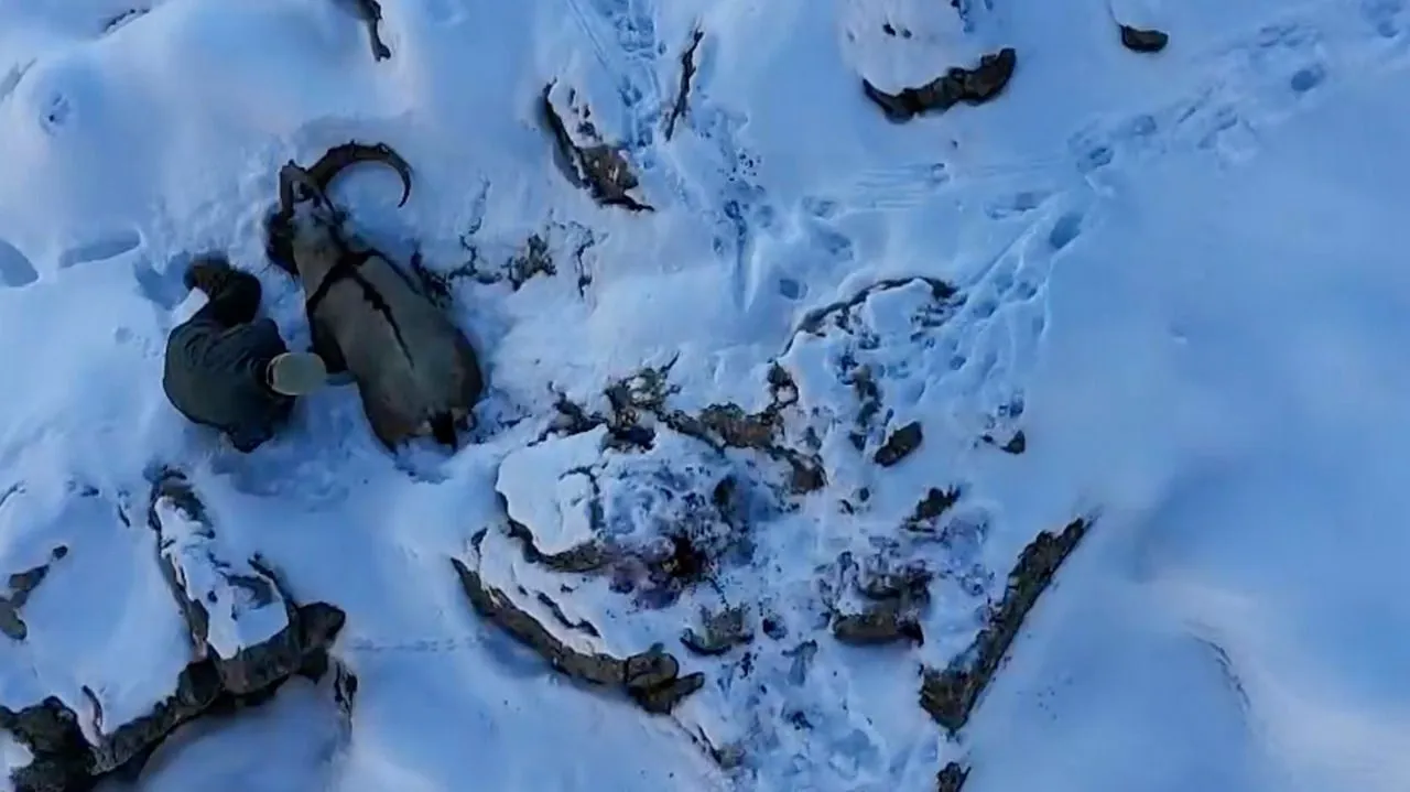 Erzincan’da bir avcının, avlanması yasak olan dağ keçisinin avladığı anlar, doğa fotoğrafçısının dron kamerasına yakalandı.