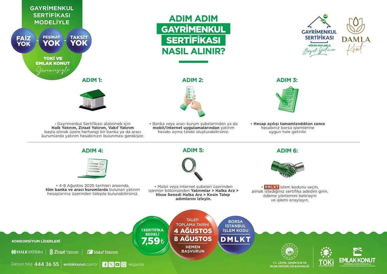 Çevre, Şehircilik ve İklim Değişikliği Bakanlığı koordinasyonunda Emlak Konut tarafından geliştirilen, SPK onayı alan geleceğin gayrimenkul finansman çözümü Gayrimenkul Sertifikası, halka arz oluyor. Sertifikalar, Borsa İstanbul'da 4-8 Ağustos 2025 tarihleri arasında "DMLKT" işlem kodu ile yatırımcılarla buluşacak. Gayrimenkul Sertifikası'nın halka arz fiyatı, değerleme fiyatı üzerinden yüzde 25 indirimle 7,59 TL olarak belirlendi. Bu model, küçük birikimlerle Damla Kent Projesi'nden ev sahibi olma fırsatı sunuyor.