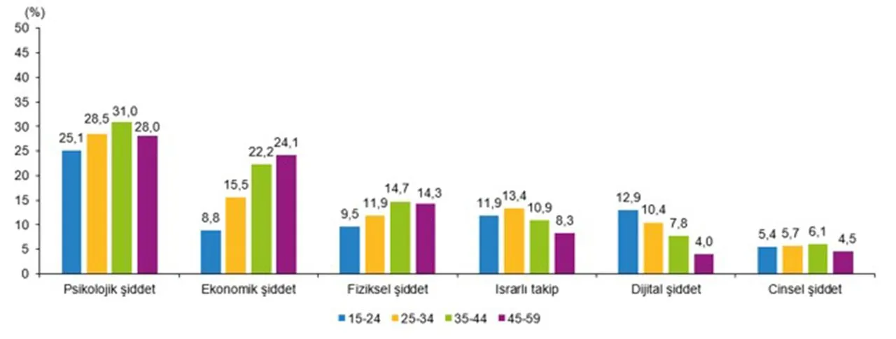 Tüm şiddet türleri yaş grubuna göre incelendiğinde, yaşamının herhangi bir döneminde fiziksel şiddete en yüksek oranda 35-44 yaş grubundaki kadınlar maruz kaldı. Bu yaş grubunu sırasıyla %14,3 ile 45-59 yaş grubundaki kadınlar; %11,9 ile 25-34 yaş grubundaki kadınlar takip etti.