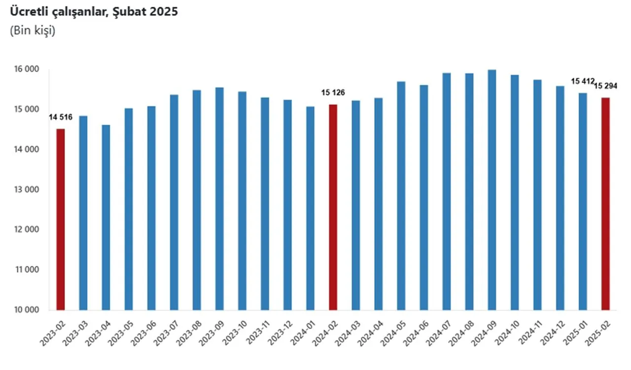 Ücretli çalışanların alt detaylarına bakıldığında; 2025 Şubat ayında ücretli çalışan sayısı yıllık olarak sanayi sektöründe %2,2 azaldı, inşaat sektöründe %2,0 arttı ve ticaret-hizmet sektöründe %2,9 arttı.