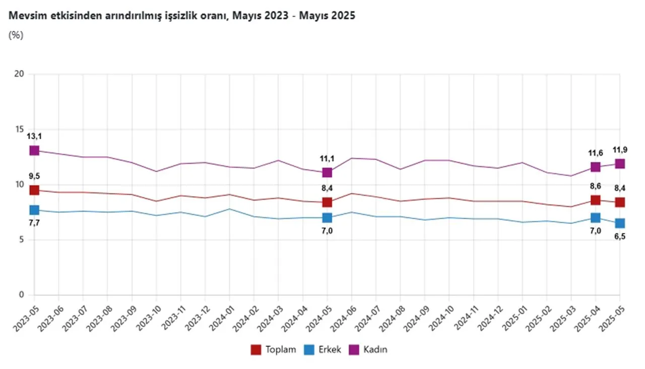 Hanehalkı İşgücü Araştırması sonuçlarına göre; 15 ve daha yukarı yaştaki kişilerde işsiz sayısı 2025 yılı Mayıs ayında bir önceki aya göre 69 bin kişi azalarak 2 milyon 972 bin kişi oldu. İşsizlik oranı ise 0,2 puan azalarak %8,4 seviyesinde gerçekleşti. İşsizlik oranı erkeklerde %6,5 iken kadınlarda %11,9 olarak tahmin edildi.