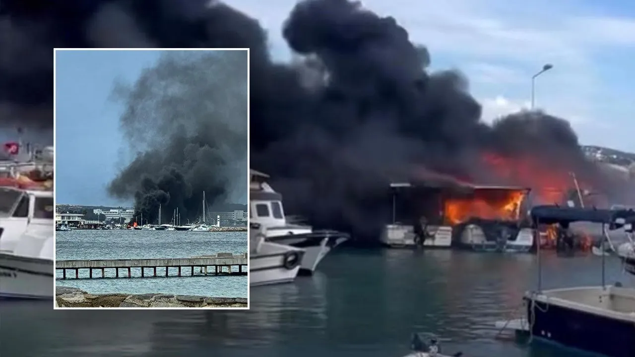 İzmir'in tatil cenneti Çeşme'de bir teknede çıkan yangın diğer teknelere de sıçradı. Gökyüzünü kaplayan kara dumanlar kilometrelerce uzaktan görüldü.