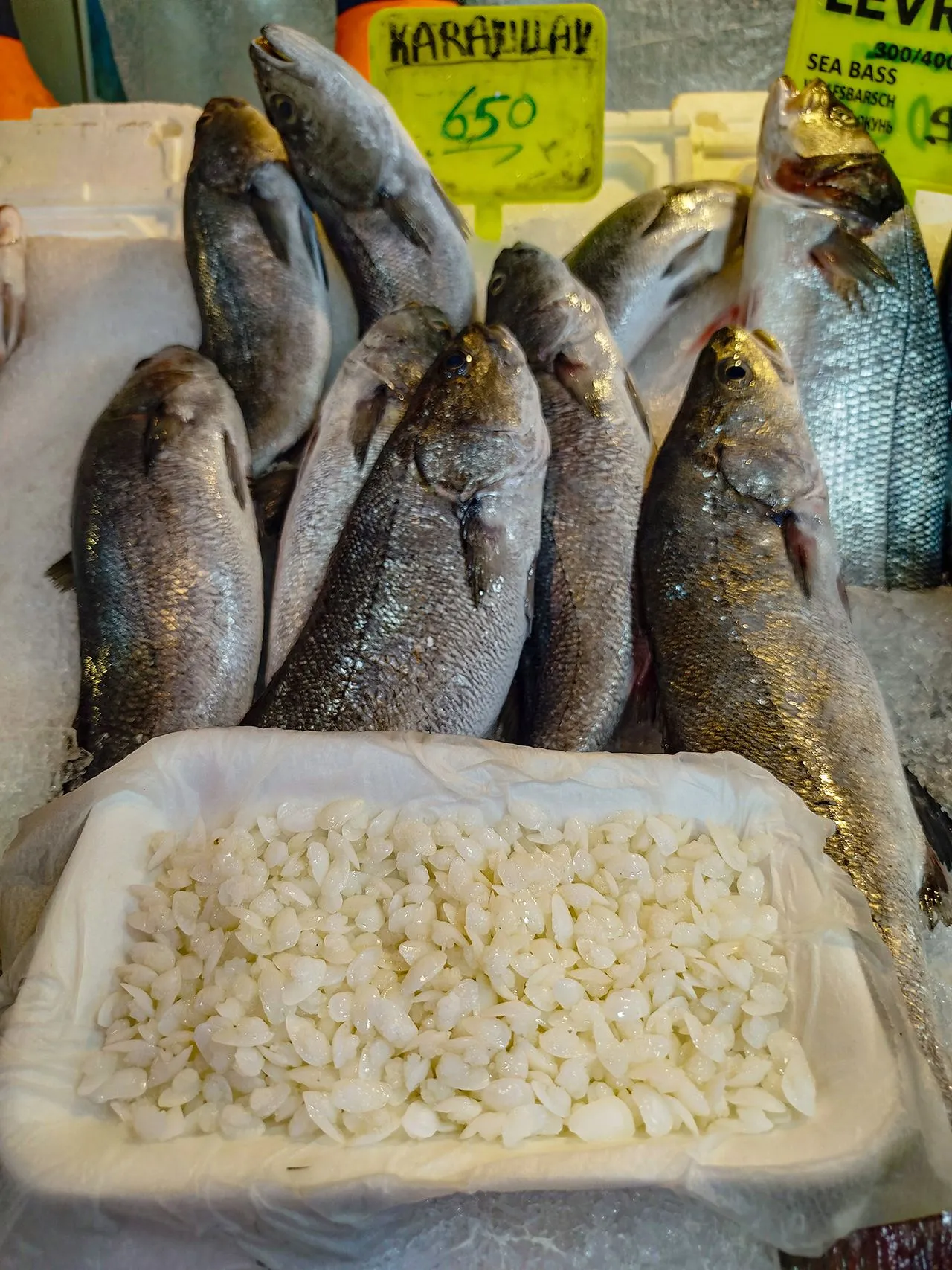 Tezgahları çeşitlendiren balıklardan kilosu 650 liraya satılan karakulak, lezzeti, iri kılçıklı olması ve başındaki taşın böbrek sancısına iyi geldiği düşüncesiyle en çok satılan türler arasında yer alıyor.