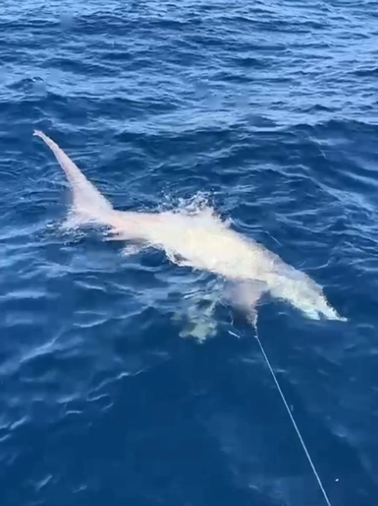 Çanakkale'nin Gökçeada ilçesi açıklarında balıkçıların oltasına 6 metre uzunluğunda sapan köpek balığı takıldı.