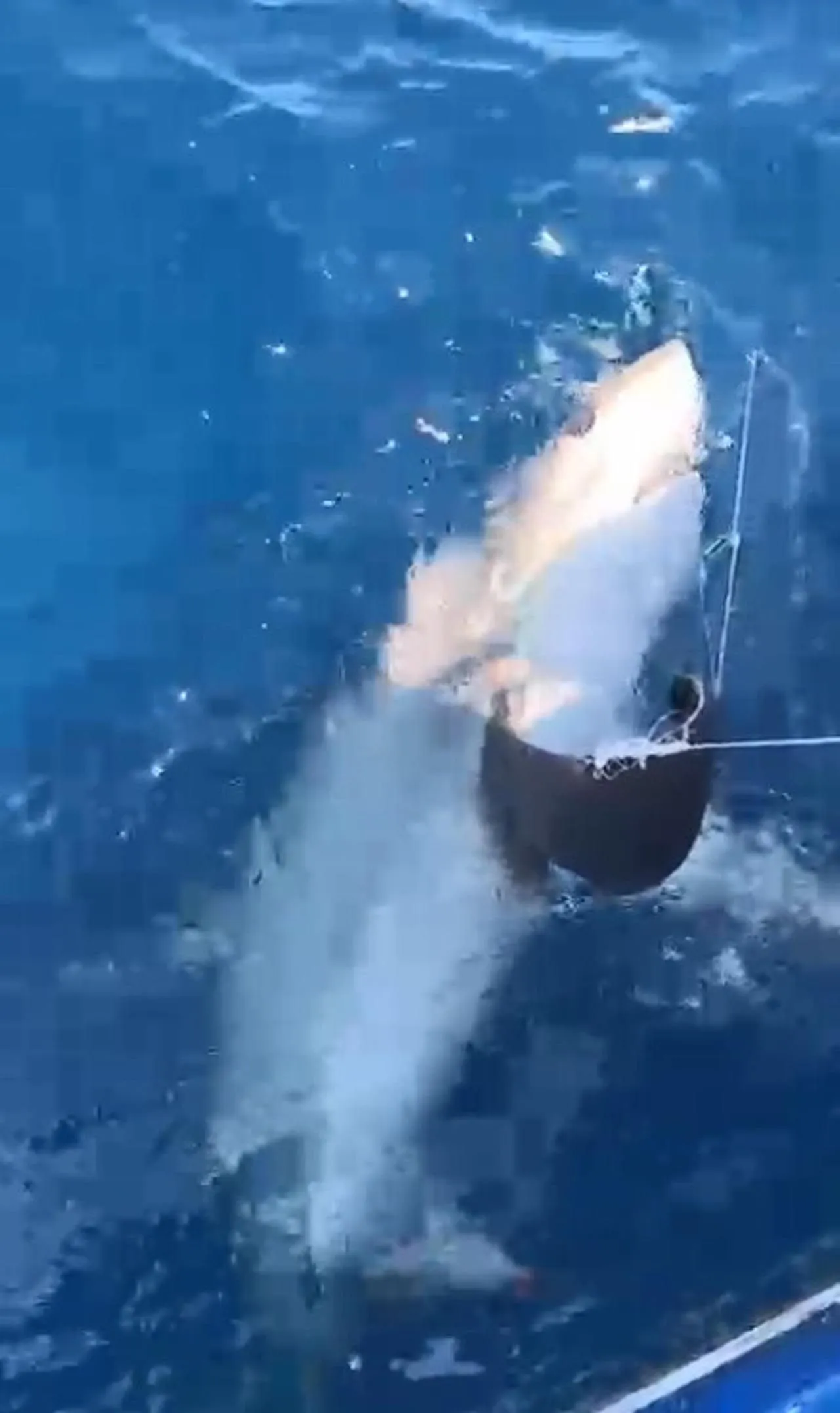 Yüzeye yaklaşan balığın yaklaşık 6 metre uzunluğunda sapan köpek balığı olduğunu fark eden balıkçılar, şaşkınlık yaşadı.