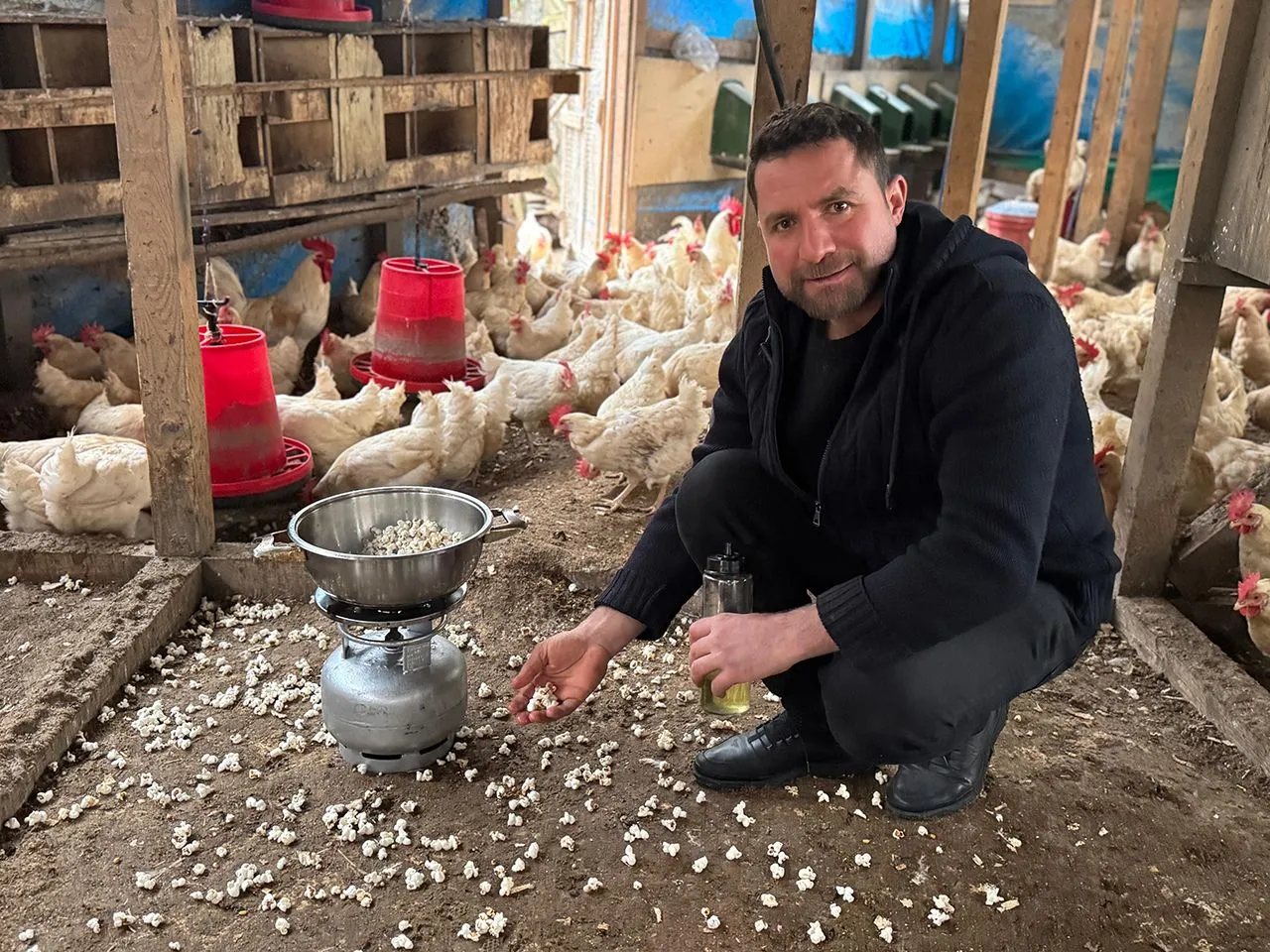 Ordu'da 15 yıldır organik yumurta üreticiliği yapan bir girişimci, kış aylarında dışarıya çıkamadıkları için strese girdiklerini düşündüğü tavukları için kümeste mısır patlatıyor.