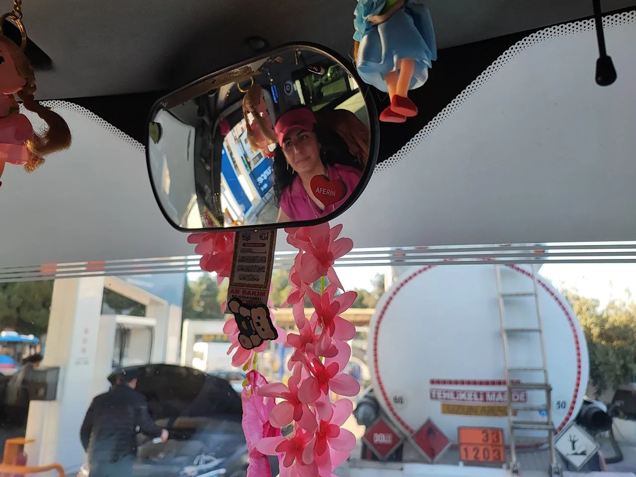 O Türkiye'nin gerçek şoför Nebahat'i... Minibüse binen şaşkınlığını gizleyemiyor Galerinin tamamı için tıklayınız Kadıoğlu'nun çalıştığı dolmuşa kadın eli değdiğini de süslemelerden görmek mümkün.