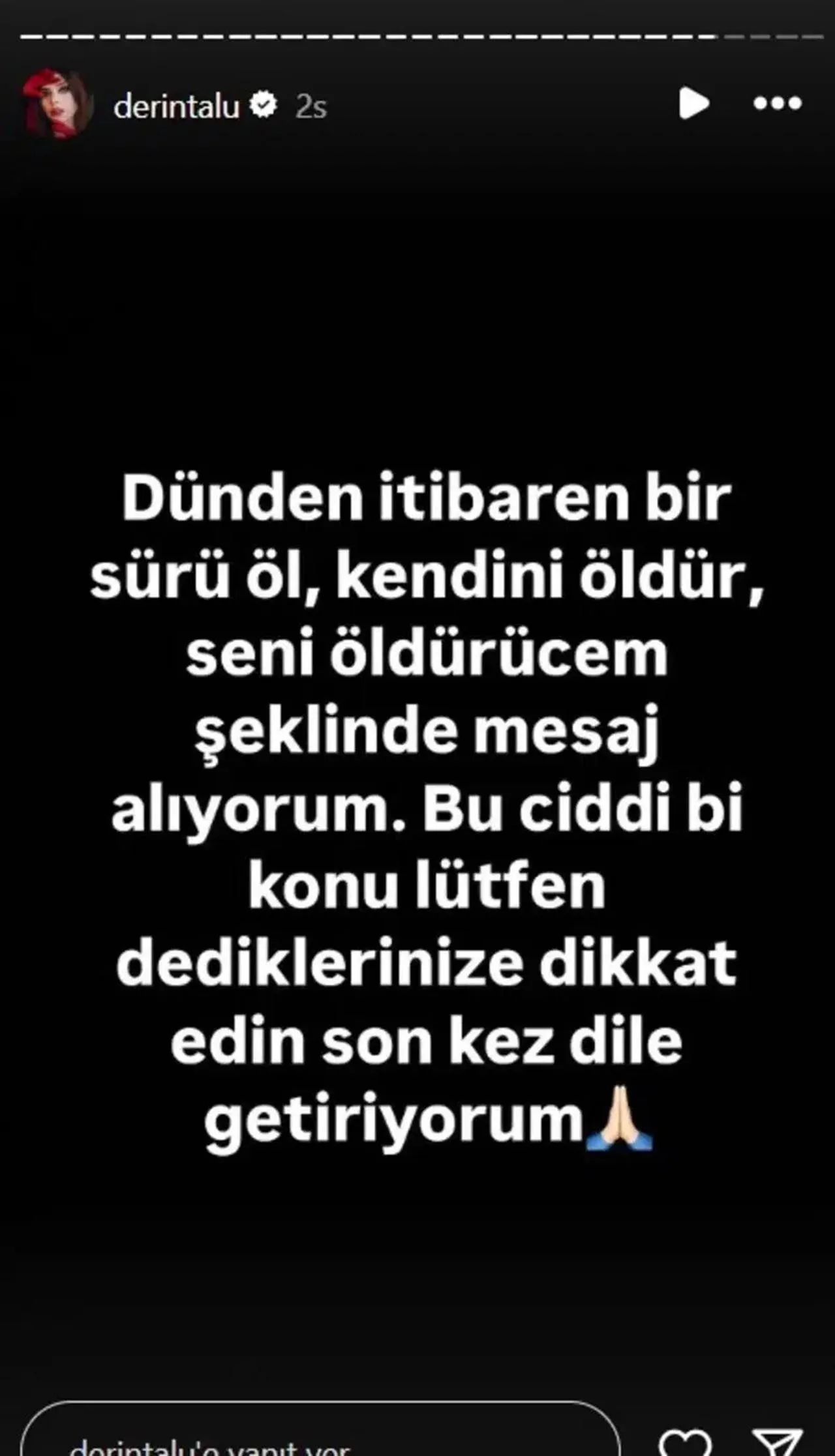 Ölüm tehditleri aldığını söyleyen Talu, ''Dünden itibaren bir sürü 'öl', 'kendini öldür', 'seni öldüreceğim' şeklinde mesaj alıyorum. Bu ciddi bir konu, lütfen söylediklerinize dikkat edin. Son kez dile getiriyorum.'' dedi.