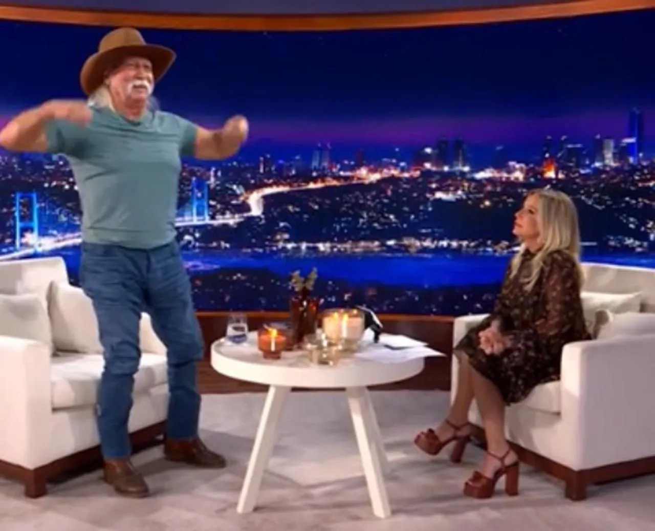 Üşümezsoy, yayında kameralara pazularını göstererek kısa bir kas şovu yaptı. Saba Tümer ise o sırada ''Aaa! Memeler de oynuyor hocam. Harikasınız ya!'' diyerek kahkahayı bastı.