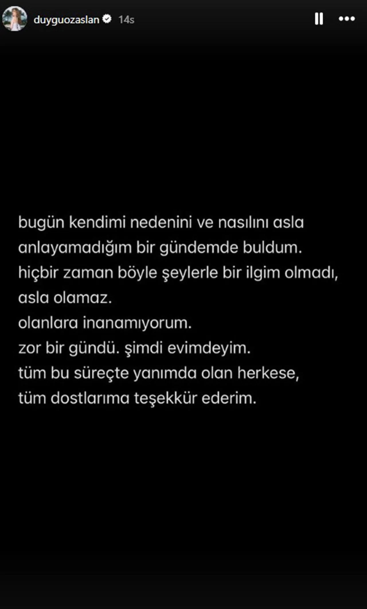 "Bugün kendimi nedenini ve nasılını asla anlayamadığım bir gündemde buldum. Hiçbir zaman böyle şeylerle bir ilgim olmadı, asla olamaz. Olanlara inanamıyorum. Zor bir gündü. Şimdi evimdeyim. Tüm bu süreçte yanımda olan herkese, tüm dostlarıma teşekkür ederim."