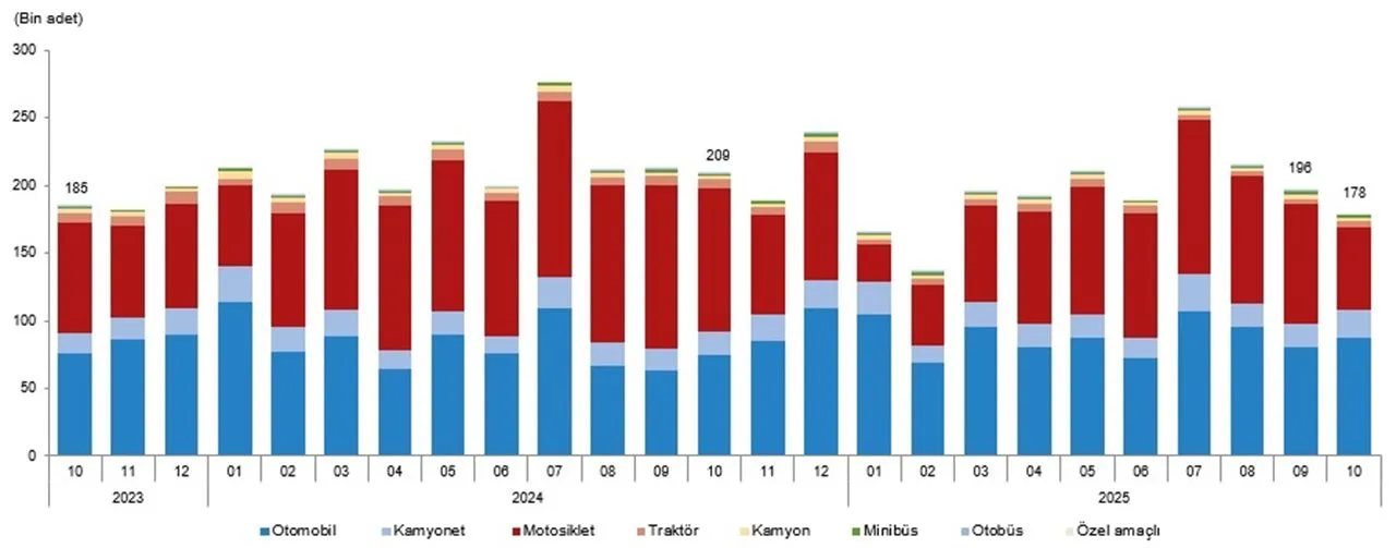 Ekim ayında trafiğe kaydı yapılan taşıt sayısı bir önceki aya göre kamyonette %18,3, otomobilde %9,0, kamyonda %7,1, traktörde %3,9 artarken minibüste %44,2, motosiklette %30,8, otobüste %19,0 ve özel amaçlı taşıtta %12,0 azaldı.