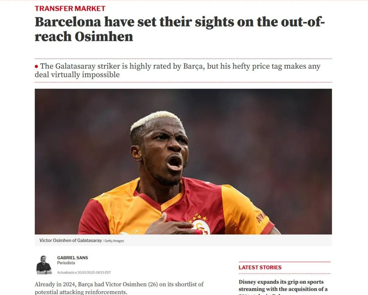 Türkiye Gazetesinin özel haberine göre; PSG ve Barcelona’nın dikkat kesildiği Osimhen için Galatasaray’ın kapısını çalmaya hazırlandığı, sarı kırmızılıların ise 140 milyon avrodan aşağıya gelen hiçbir teklife cevap bile vermeyeceği belirtildi.
