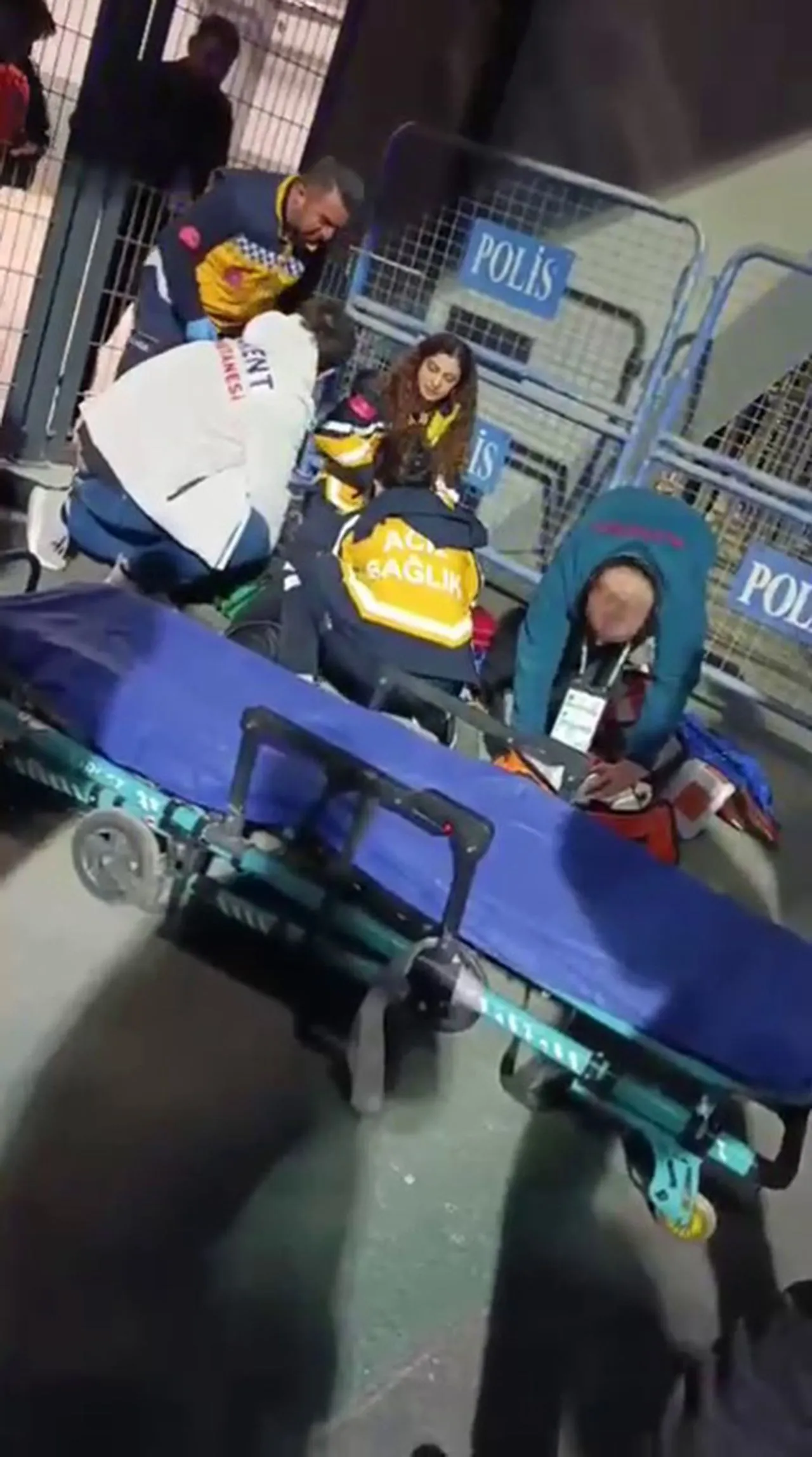 Galerinin tamamı için tıklayınızÇevredekilerin haber vermesi üzerine sağlık ekipleri olay yerine çağrıldı. İlk müdahalesini stadyumun dışında yapan sağlık ekipleri kalbi duran genç taraftar H.K.’a dakikalarca kalp masajı yaptı.