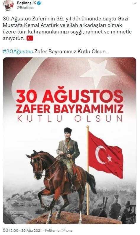 BEŞİKTAŞ: 30 Ağustos Zaferi'nin 99. yıl dönümünde başta Gazi Mustafa Kemal Atatürk ve silah arkadaşları olmak üzere tüm kahramanlarımızı saygı, rahmet ve minnetle anıyoruz. Türkiye Bayrağı