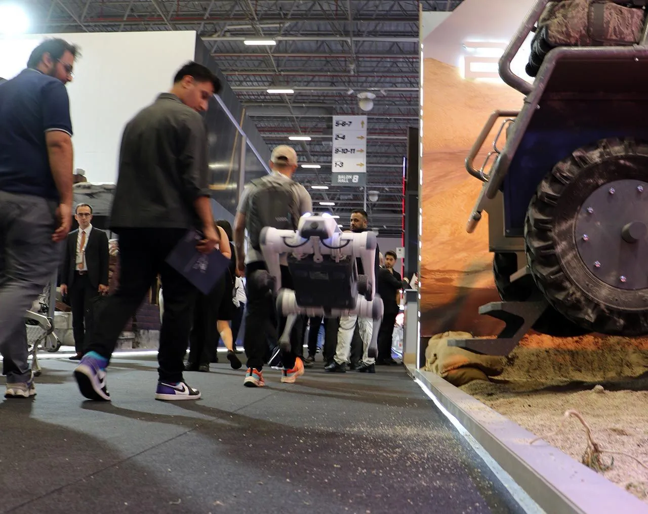 IDEF'te sergilenen dört ayaklı insansız kara aracı olan robot köpekler, hem zıplıyor, hem takla atıyor hem de selam veriyor. Robot köpeklere ziyaretçiler yoğun ilgi gösterdi.
