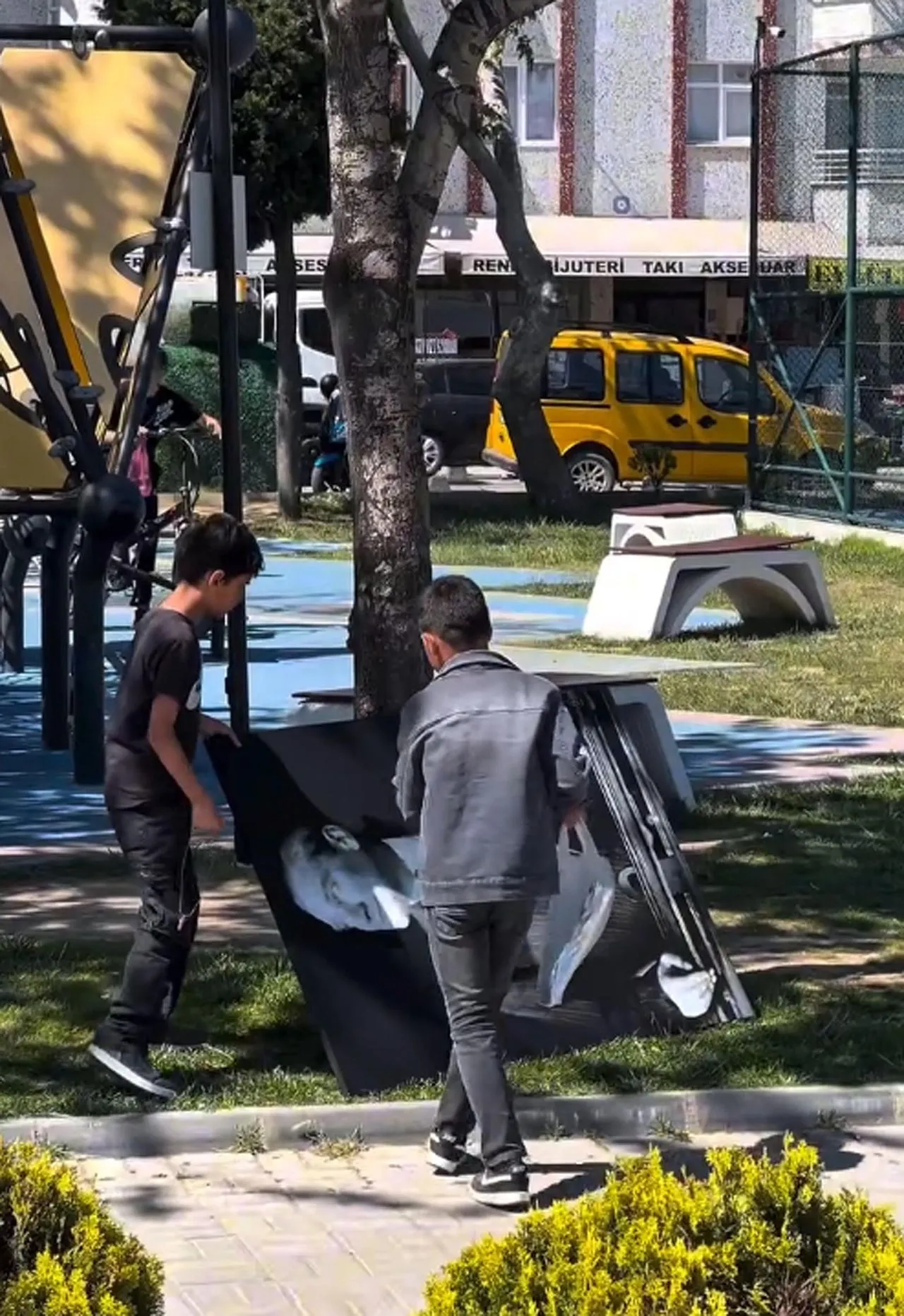 İlginç anların yaşandığı deney sırasında izlenen görüntülerde bir parkta ağaca yatay bırakılan Atatürk portresini düzelten iki çocuk, ardından öperek bölgeden uzaklaştı.
