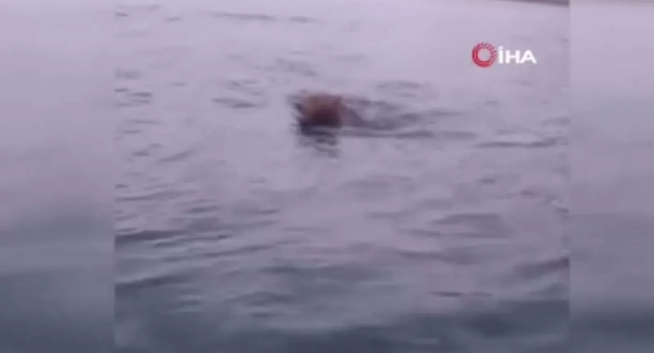 Sinop'ta Boyabat Barajı'na balık tutmak için giden vatandaşlar, barajda yüzen ayıyla karşılaştı. O anlar cep telefonu kamerasına yansıdı.