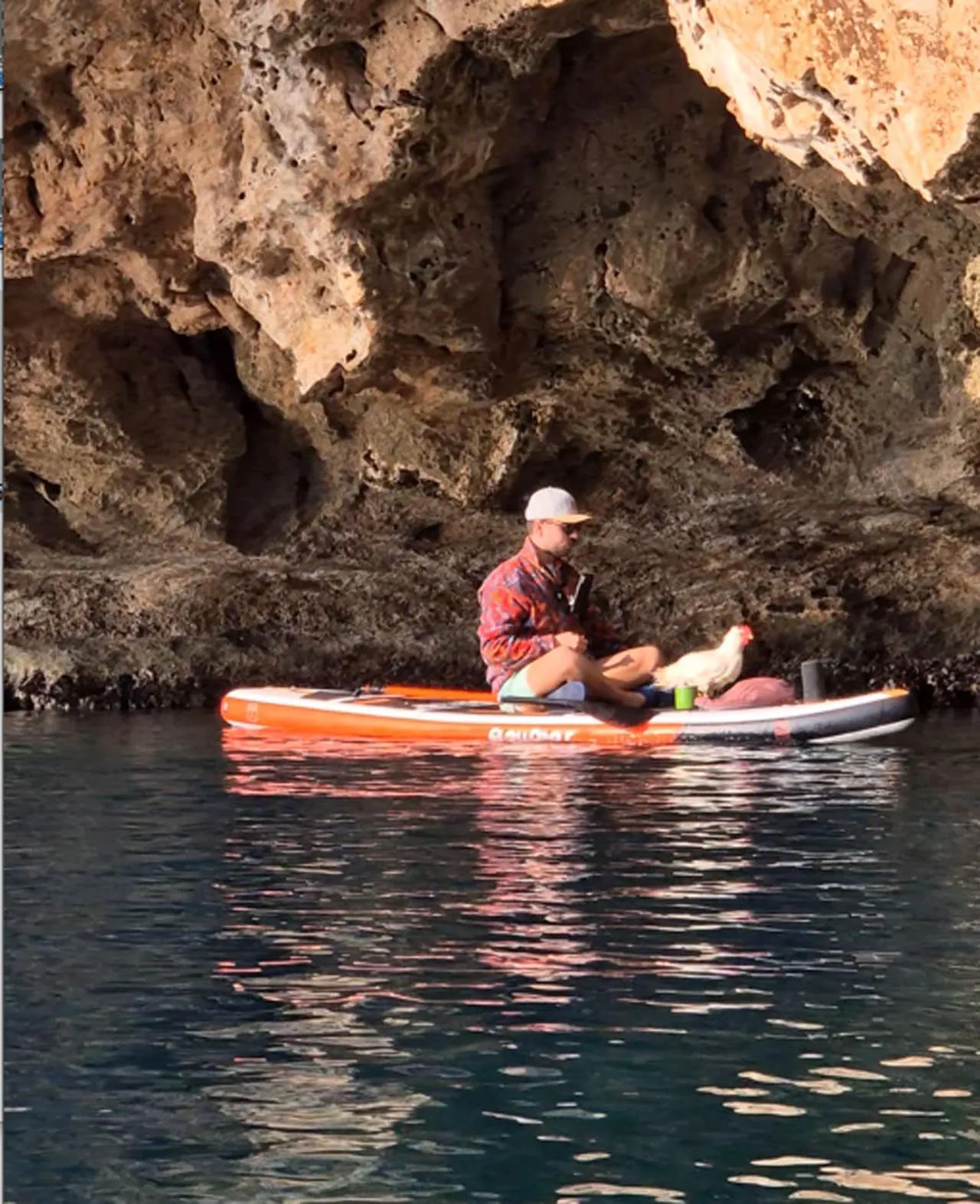 Önce martı zannettikleri canlının tavuk olduğunu gören Tahir Özden, hayvanı sudan alıp sörf tahtasının üzerine koydu.