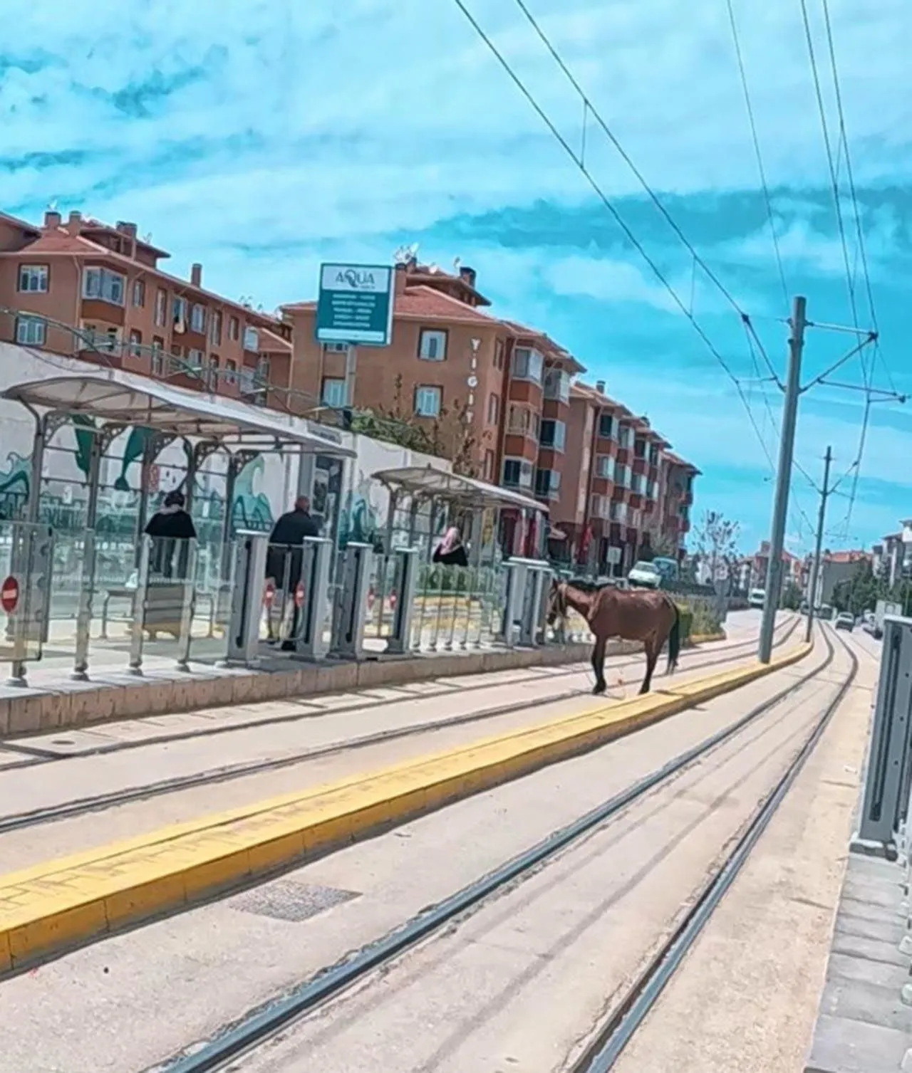 Eskişehir'de bir tramvay durağında rayların üzerinde dolaşan başıboş at, görenleri şaşkına çevirdi.