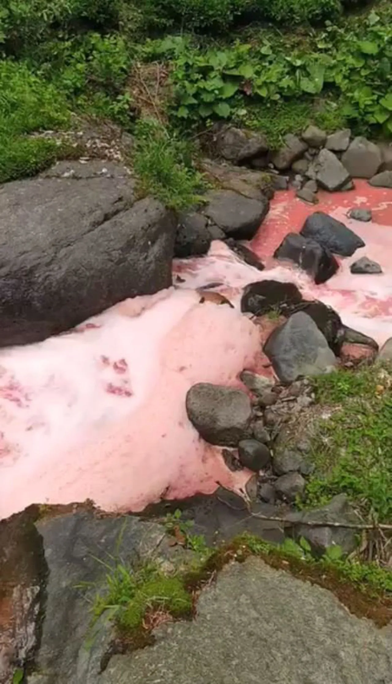 Çevrede bulunan Mevlüt Ak, kırmızı renkte, yer yer köpük şeklini alan suyun aktığı dereyi cep telefonu kamerasıyla görüntüledi.