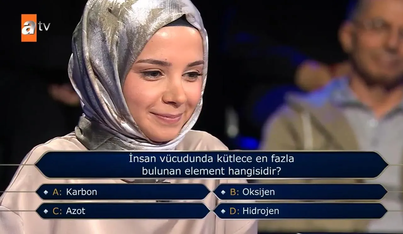 Programın sunucusu Oktay Kaynarca, İstanbul Üniversitesi Tıp Fakültesi mezunu olan Sümeyye Hanım'a, ''İnsan vücudunda kütlece en fazla bulunan element hangisidir?'' sorusunu yöneltti.
