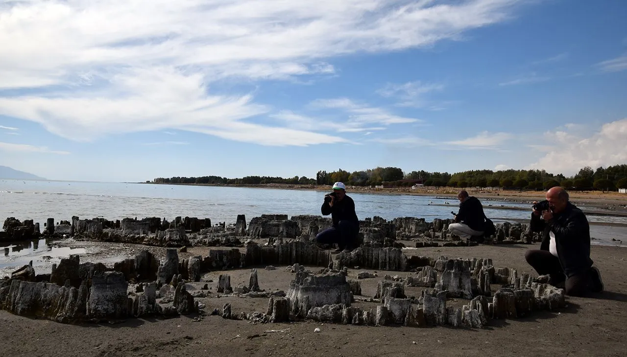 Van Gölü'nde küresel iklim değişikliği ve kuraklığa bağlı olarak yaşanan çekilmeyle birlikte gün yüzüne çıkan mikrobiyalitler, fotoğrafçıların ilgi odağı oldu.