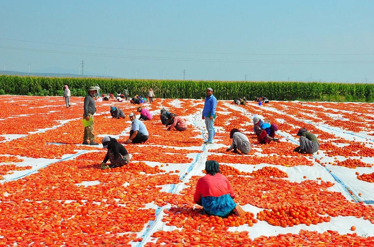 Türkiye'de sanayi tipi domates üretiminde 2'nci sırada yer alan, kurutulmuş domatesin de önemli merkezlerinden olan Manisa'nın Saruhanlı ve Turgutlu ilçelerinde hasat edilen ürünler, kurutulmak için tarlalara serilmeye başlandı.
