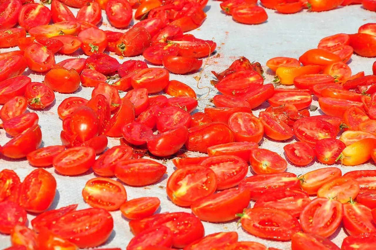 Kadın işçiler tarafından taze bir şekilde toplanarak, kasalara doldurulan domatesler, getirildiği sergi alanlarında yine kadınlar tarafından kesilerek, kurutulmaya bırakılıyor. Haftalar süren kurutulma işlemi ardından tesislerde işlenen domatesler daha sonra ihraç ediliyor.