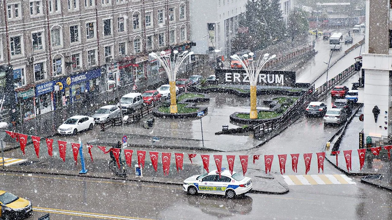 Erzurum'da dün gece etkili olan sağanak yerini sabah saatlerinde kar yağışına bıraktı.