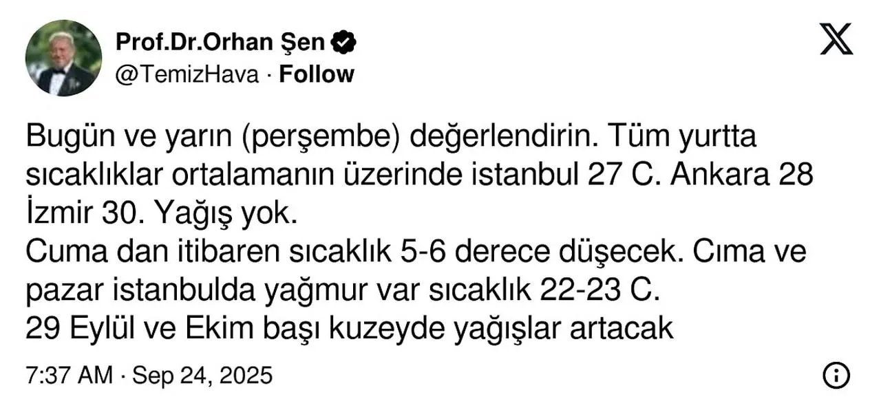 Orhan Şen'in açıklamasında "Bugün ve yarın (25 Eylül Perşembe) değerlendirin. Tüm yurtta sıcaklıklar ortalamanın üzerinde istanbul 27 derece. Ankara 28 derece, İzmir 30 derece. Yağış yok. Cumadan itibaren sıcaklık 5-6 derece düşecek. Cuma ve pazar İstanbul'da yağmur var sıcaklık 22-23 derece. 29 Eylül ve Ekim başı kuzeyde yağışlar artacak sıcaklık dahada düşecek. Montlarınızı çıkartın. Kuzeyde yaz bitti.' ifadelerini kullandı.
