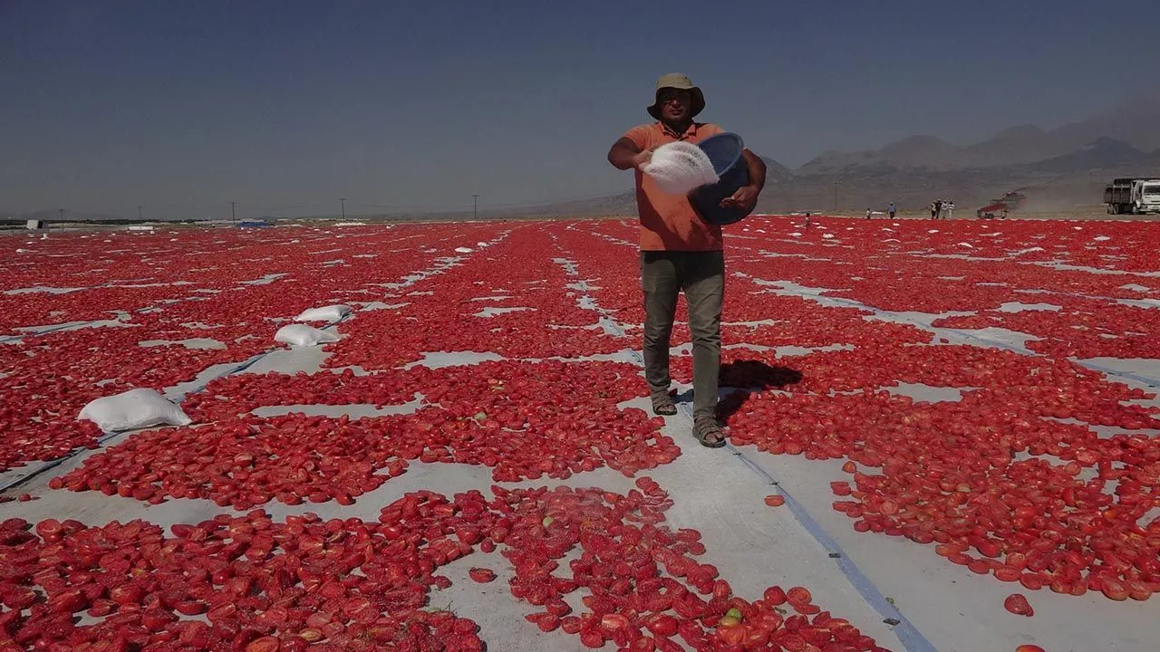İlçede bulunan yaklaşık 500 dönümlük tarlalardaki sergi alanlarına serilmeye başlanan yaklaşık bin 500 ton domates, güneş altında doğal yöntemlerle kurutulduktan sonra ihraç ediliyor.