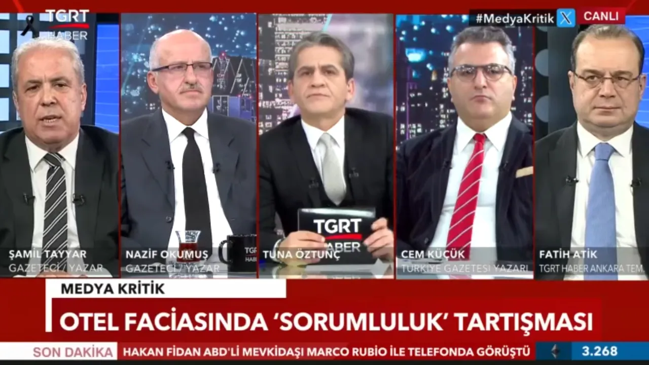 AK Parti eski milletvekili Şamil Tayyar, Bolu Kartalkaya Kayak Merkezi'nde bulunan Grand Kartal Otel'de çıkan ve 79 yurttaşın hayatını kaybettiği yangına ilişkin, "Bu otel, Bolu Belediyesi'nin sınırlarında değildir. Turizm belgeli işletmelerin denetimi Turizm Bakanlığı'na aittir" ifadelerini kullandı.