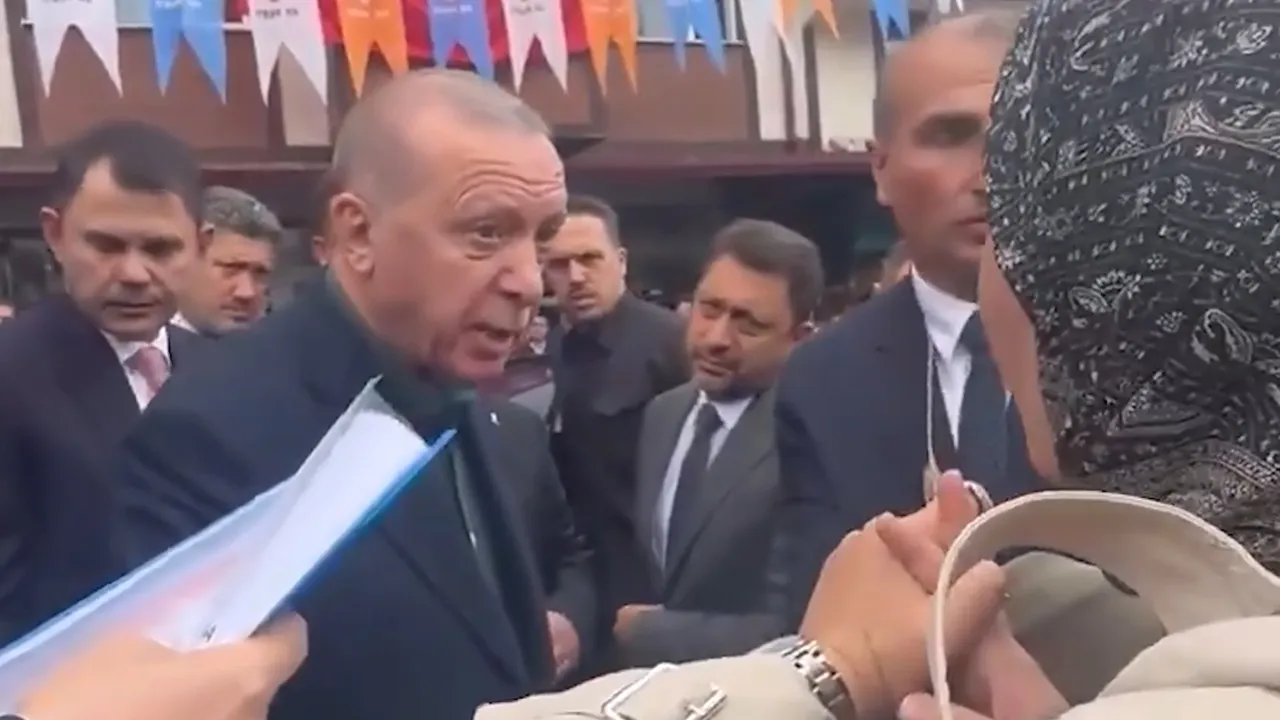 Elindeki mavi dosyayı kadınlara gösteren koruma, 'Dosyanız bu değil mi?' diye sordu. Genç kadınların dosyanın kendilerinin olduğunu ifade edip şikayetlerini dile getirmeye devam ederken Erdoğan yeniden 'Kızım benim yerim burası değil Ankara' dedi.