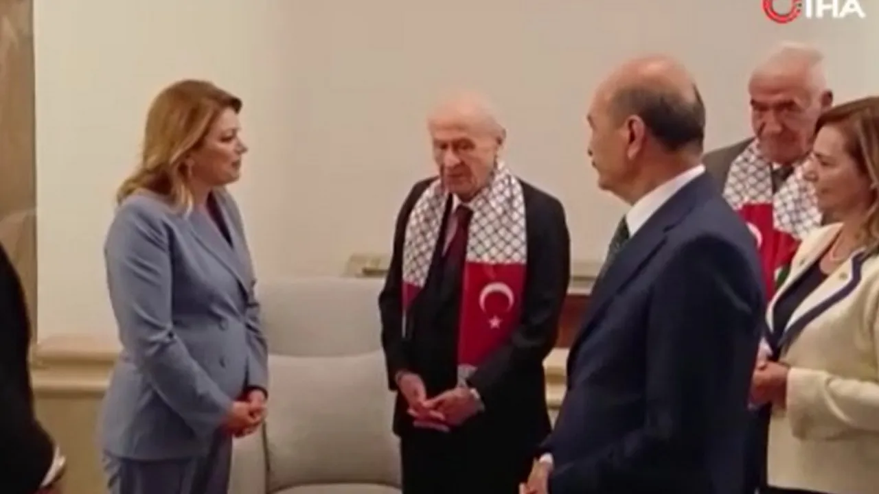 MHP Genel Başkanı Devlet Bahçeli, kuliste CHP Osmaniye Milletvekili Asu Kaya ve Yeni Yol Grubu'yla selamlaştı.