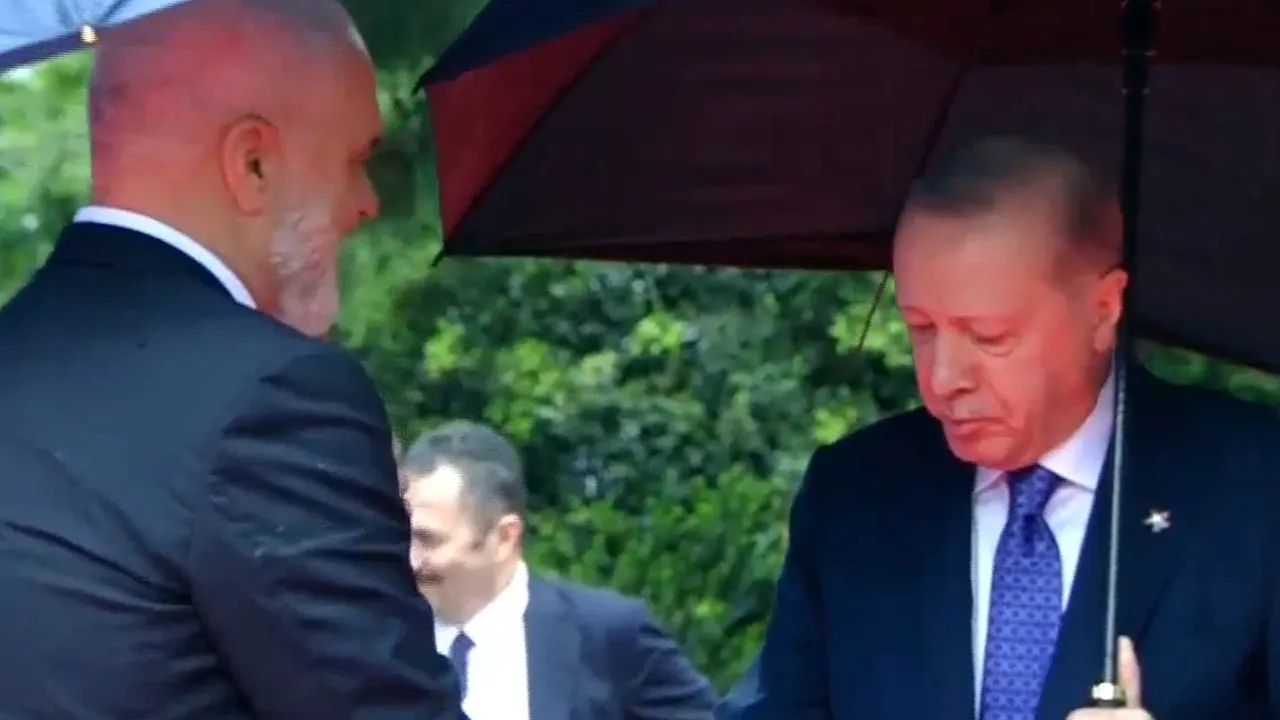 Arnavutluk Başbakanı Edi Rama tarafından resmi törenle karşılanan Erdoğan, kameralara poz verdi. İki liderin yağmur altındaki buluşmasına ise Rama'nın beyaz spor ayakkabıları damga vurdu. Erdoğan'ın o anlarda ayakkabıları göstererek Rama'ya bir şeyler dediği görülüyor.