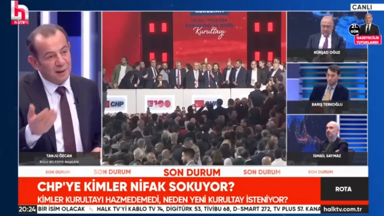 CHP'li Bolu Belediye Başkanı Tanju Özcan, Halk TV ekranlarında katıldığı canlı yayında CHP'deki kurultay tartışmalarıyla ilgili olarak "Sayın Erdoğan bu tartışmaları ortaya attı. Sayın Kılıçdaroğlu da ateşe odun attı." dedi. Özcan'ın "bana terliği bile koysak Erdoğan yüzde 26'yı geçemiyor" diyen CHP'liler vardı sözü canlı yayına damgasını vurdu.